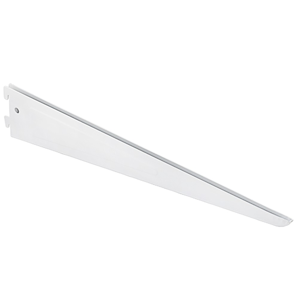 Double shelf bracket, made of metallic material, in white color, which is suitable for single-slotted shelving systems. The constituent material is resistant to use, heavy weights, rust or abrasion. This product is suitable for use in the construction of LSS (Long Span Storage) shelving structures that are placed in toilets, hotel laundries, basements of houses, offices or various workshops, to help in organizing the limited spaces.