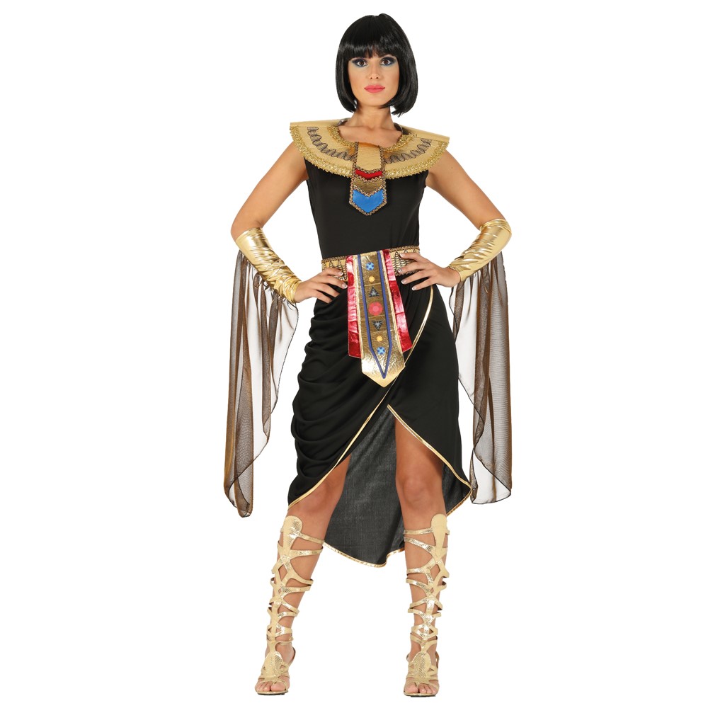 Queen's Egyptian themed suit, the suit is made of 100% polyester material, from a long dress in black, 1 large oval collar in gold, 2 half tulle gloves hanging in gold and black and 1 belt in the middle in gold color with ties.Size M (38), Chest size: 93-96 cm