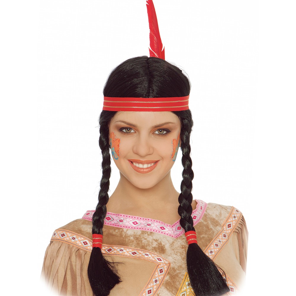 Wig, Indian, decorated with feathers made of 90% synthetic material, 10% polyester, in black and red color. The wig has long braided hair and a hair band to which a feather is attached. Ideal to wear during the carnival or at an Indian themed party.