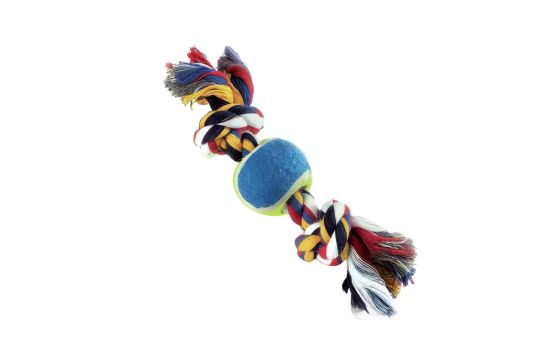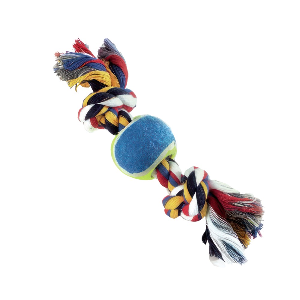 This tough and resistant toy will delight your pet! Your dog will have fun with this bone made of a knotted cotton rope with a tennis ball in the middle. Available in a variety of shapes and colours.
