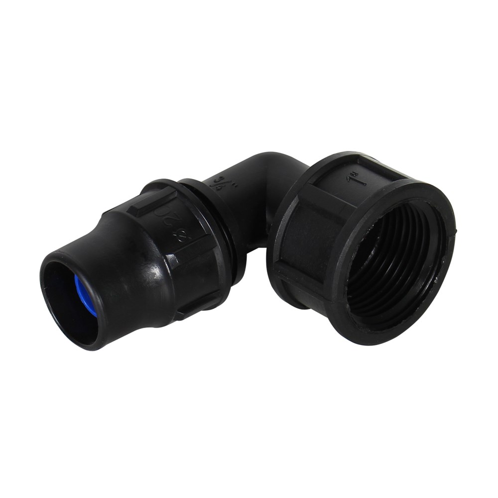 Elbow with faucet of PE 20x1" female with angle 90°. Used to installations angular water supply infrastructure lines, in irrigation and agricul, etc. This elbow enables network branching 90° angle. This elbow connect LDPE pipe Ø 20 with other fittings by fillet, for joining the fillet recommend tu use teflon whiles pipe connect whith elbow in mechanically with faucet. Manufactured with European standards, resistant to corrosive materials designed to withstand pressure up to 6 Bar.