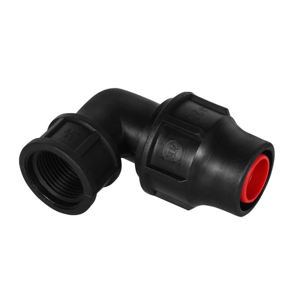 Elbow with faucet of PE 25x3/4" female with angle 90°. Used to installations angular water supply infrastructure lines, in irrigation and agricul, etc. This elbow enables network branching 90° angle. This elbow connect LDPE pipe Ø 25 with other fittings by fillet, for joining the fillet recommend tu use teflon whiles pipe connect whith elbow in mechanically with faucet. Manufactured with European standards, resistant to corrosive materials designed to withstand pressure up to 6 Bar.