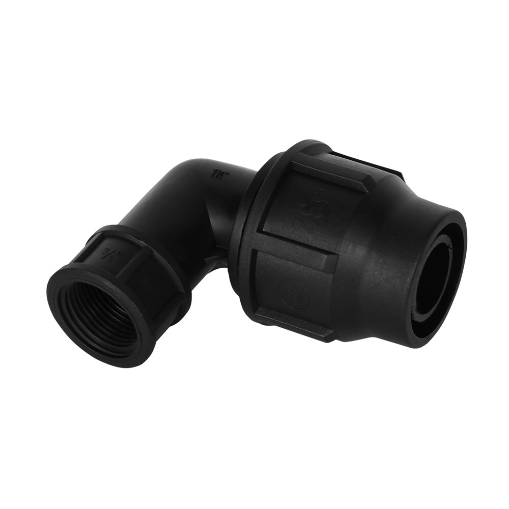 Elbow with faucet of PE 32x3/4" female with angle 90°. Used to installations angular water supply infrastructure lines, in irrigation and agricul, etc. This elbow enables network branching 90° angle. This elbow connect LDPE pipe Ø 32 with other fittings by fillet, for joining the fillet recommend tu use teflon whiles pipe connect whith elbow in mechanically with faucet. Manufactured with European standards, resistant to corrosive materials designed to withstand pressure up to 6 Bar.