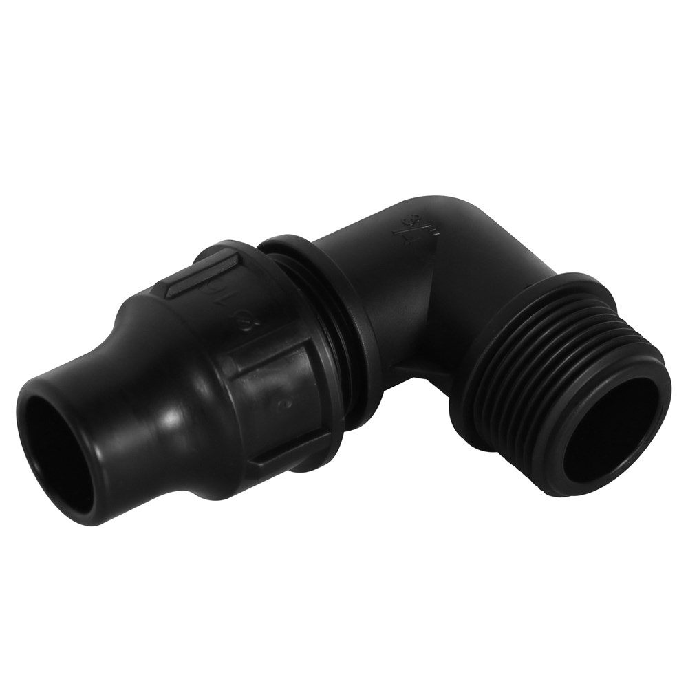 Elbow with faucet of PE 16x3/4" male with angle 90°. Used to installations angular water supply infrastructure lines, in irrigation and agricul, etc. This elbow enables network branching 90° angle. This elbow connect LDPE pipe Ø 16 with other fittings by fillet, for joining the fillet recommend tu use teflon whiles pipe connect whith elbow in mechanically with faucet. Manufactured with European standards, resistant to corrosive materials designed to withstand pressure up to 6 Bar.