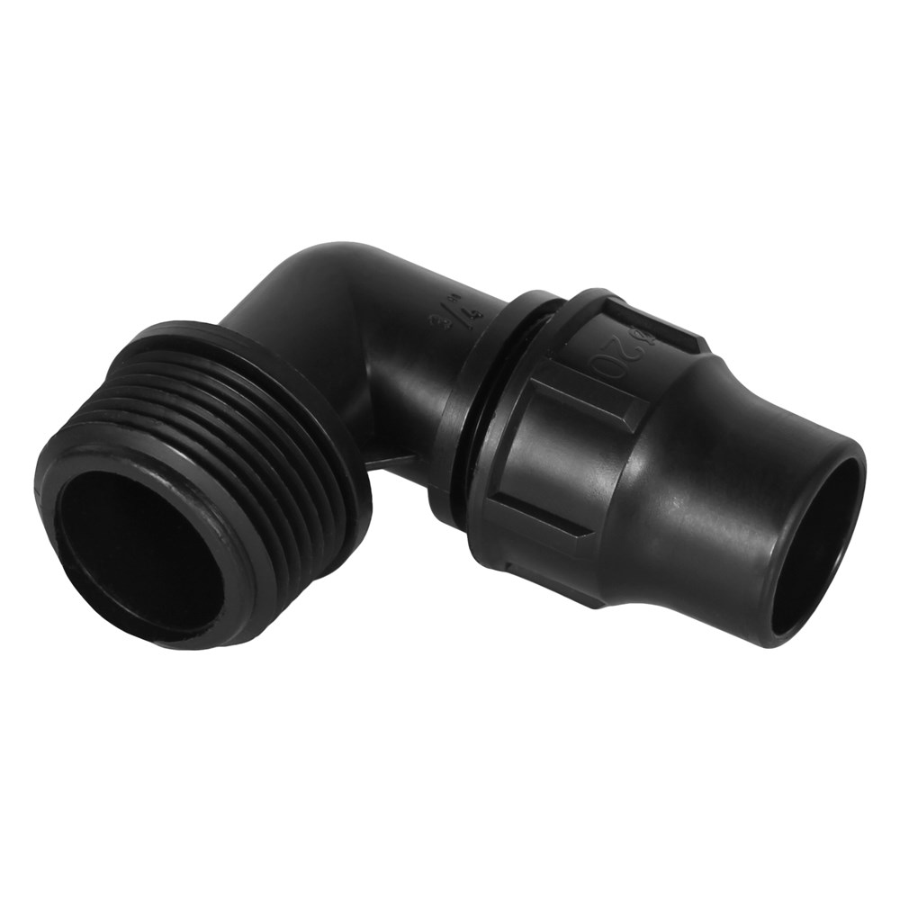 Elbow with faucet of PE 20x1" male with angle 90°. Used to installations angular water supply infrastructure lines, in irrigation and agricul, etc. This elbow enables network branching 90° angle. This elbow connect LDPE pipe Ø 20 with other fittings by fillet, for joining the fillet recommend tu use teflon whiles pipe connect whith elbow in mechanically with faucet. Manufactured with European standards, resistant to corrosive materials designed to withstand pressure up to 6 Bar.