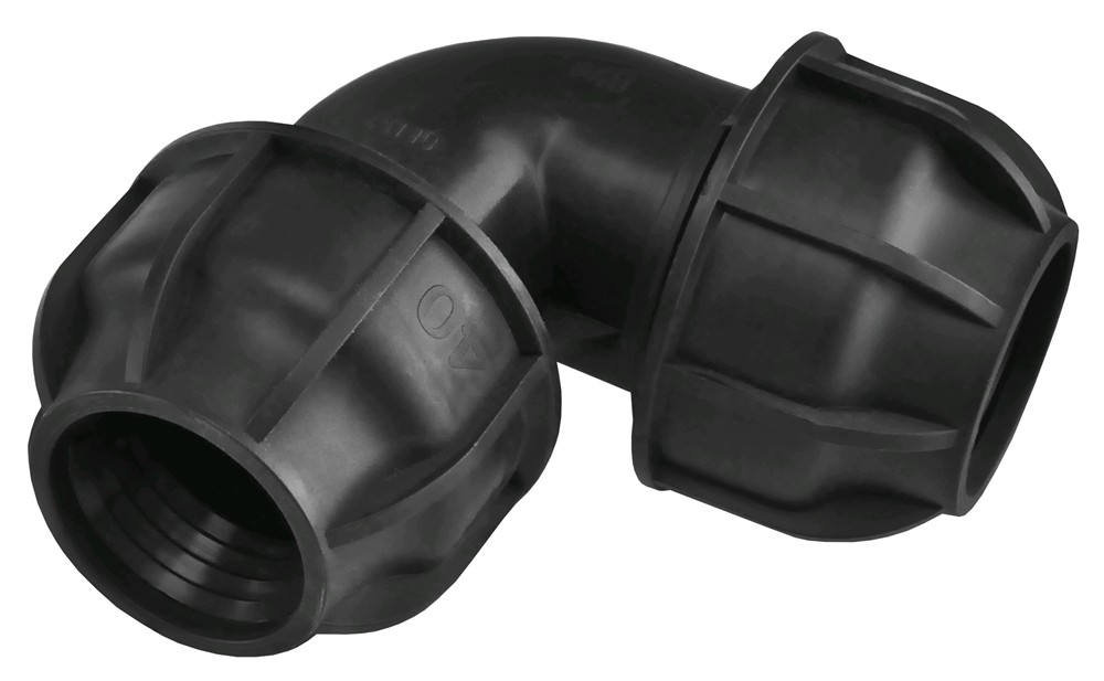 Elbow with faucet of PP 50x50mm with angle 90° used to installations angular water supply infrastructure lines, in irrigation and agricul, etc. The elbow enables network returns 90° angle. Elbow network connects two pipes through coercive mechanical faucet. Manufactured with European standards, resistant to corrosive materials designed to withstand pressure up to 10bar.