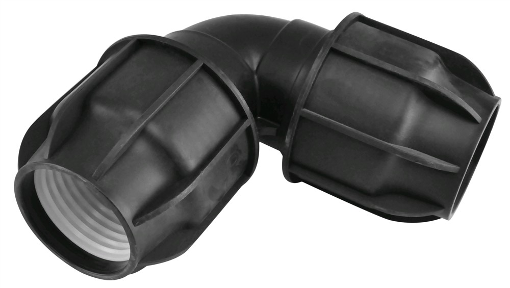 Elbow with faucet of PP 90x90mm with angle 90° used to installations angular water supply infrastructure lines, in irrigation and agricul, etc. The elbow enables network returns 90° angle. Elbow network connects two pipes through coercive mechanical faucet. Manufactured with European standards, resistant to corrosive materials designed to withstand pressure up to 10bar.