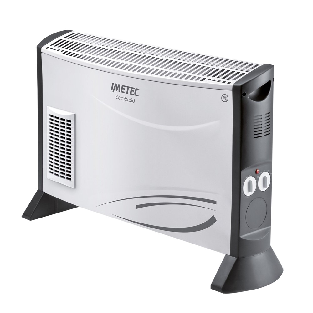 Imetec Eco Rapid. Type: Electric convection heater, Cable length: 1.5 m. Suitable for: Indoor, Placement options: Floor, Color of product: Gray, White. Thermal power: 2000 W, Thermostat control type: Mechanical. Power: 2000 W, AC input voltage: 230 V, AC input frequency: 50 Hz. Width: 695 mm, Depth: 180 mm, Height: 430 mm