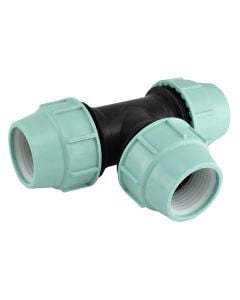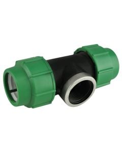 Tee with faucet of PP 50x1-1/4"x50 mm female with angle 90°. Used to installations angular water supply infrastructure lines, in irrigation and agricul, etc. This tee enables network branching 90° angle. This tee connect pipe Ø 50 with other fittings by fillet, for joining the fillet recommend tu use teflon whiles pipe connect whith tee in mechanically with faucet. Manufactured with European standards, resistant to corrosive materials designed to withstand pressure up to 10 Bar.