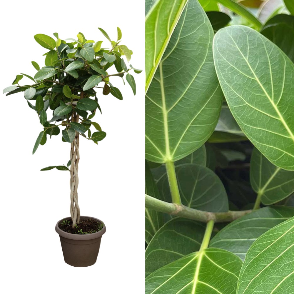 Give life to your environment with a Ficus flower, with many glossy green and cream variegated leaves creates a gorgeous weeping plant to soften any space. Perfect for adding life and structure to your room with the added benefit of helping to purify the air. It doesn't have many needs, as long as you find a bright spot away from direct sunlight, not close to a heat source like a radiator and away from any draughts it will usually be happy. Once it has the right place try not to move it as they don't like being moved around. Water with tepid water when the soil is just starting to dry out on the surface, but don't let it dry out completely. During the winter you can reduce the watering. Mist the leaves in the summer months, and feed with a liquid fertiliser during the growing season.