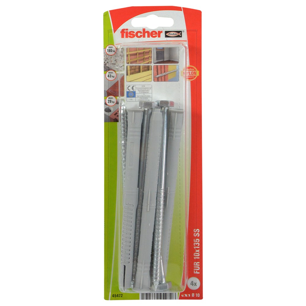 he fischer frame fixing FUR SS consists of a fixing sleeve made of high-quality nylon and a hexagonal screw made of zinc-plated steel. The FUR-SS is set in the time-saving through-type installation. When driving in the screw, the teeth expand in the solid building material and against the drill hole wall. In hollow building materials, the teeth expand through the solid part of the block and form an undercut in the cavity. The fischer frame fixing FUR is suitable for securely fixing squared timbers, gates, and doors in all building materials.
