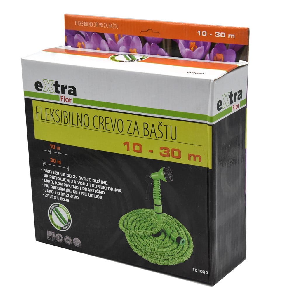 Made of high elasticity materials, capable of extending up to 3 times the initial length. With special clothing for protection against UV degradation and the many cracks that may arise as a result of daily work. Lightweight and easily depositable. With sprayer suitable for many forms of watering during irrigation depending on the position to be irrigated and the type of flower. It also serves best for cleaning various floor surfaces due to the high pressure option. Easily adaptable to standard torque. Ideal for maintaining the garden of your home, business or factory.