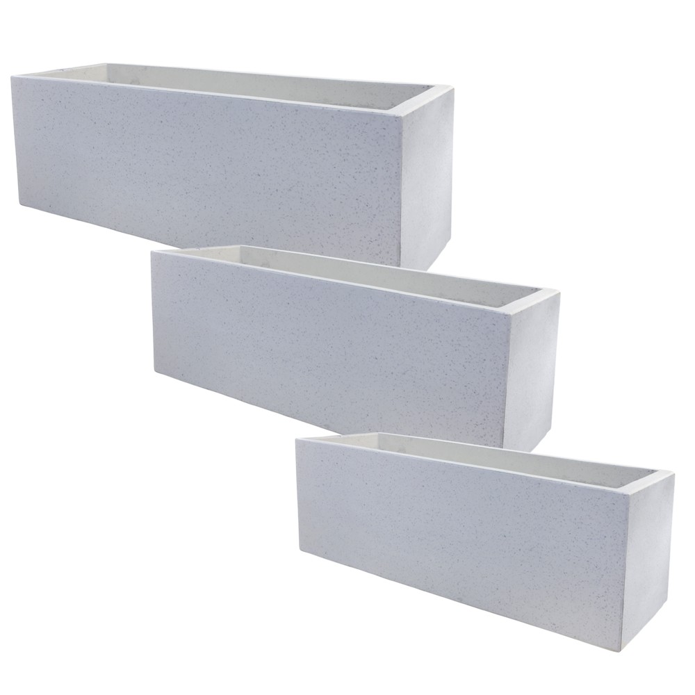 The set of 3 concrete flower pots is an element that should be added to the decoration of your environment. In three different sizes, you can create a very pleasant decoration in the spaces of your gardens and environments. The vase is made of concrete and resistant to external atmospheric conditions. The white color adds elegance and creates a sophisticated decoration. The dimensions of the vases are: S: 60x20xH20cm; M: 80x30xH30cm, L: 100x40x40cm.