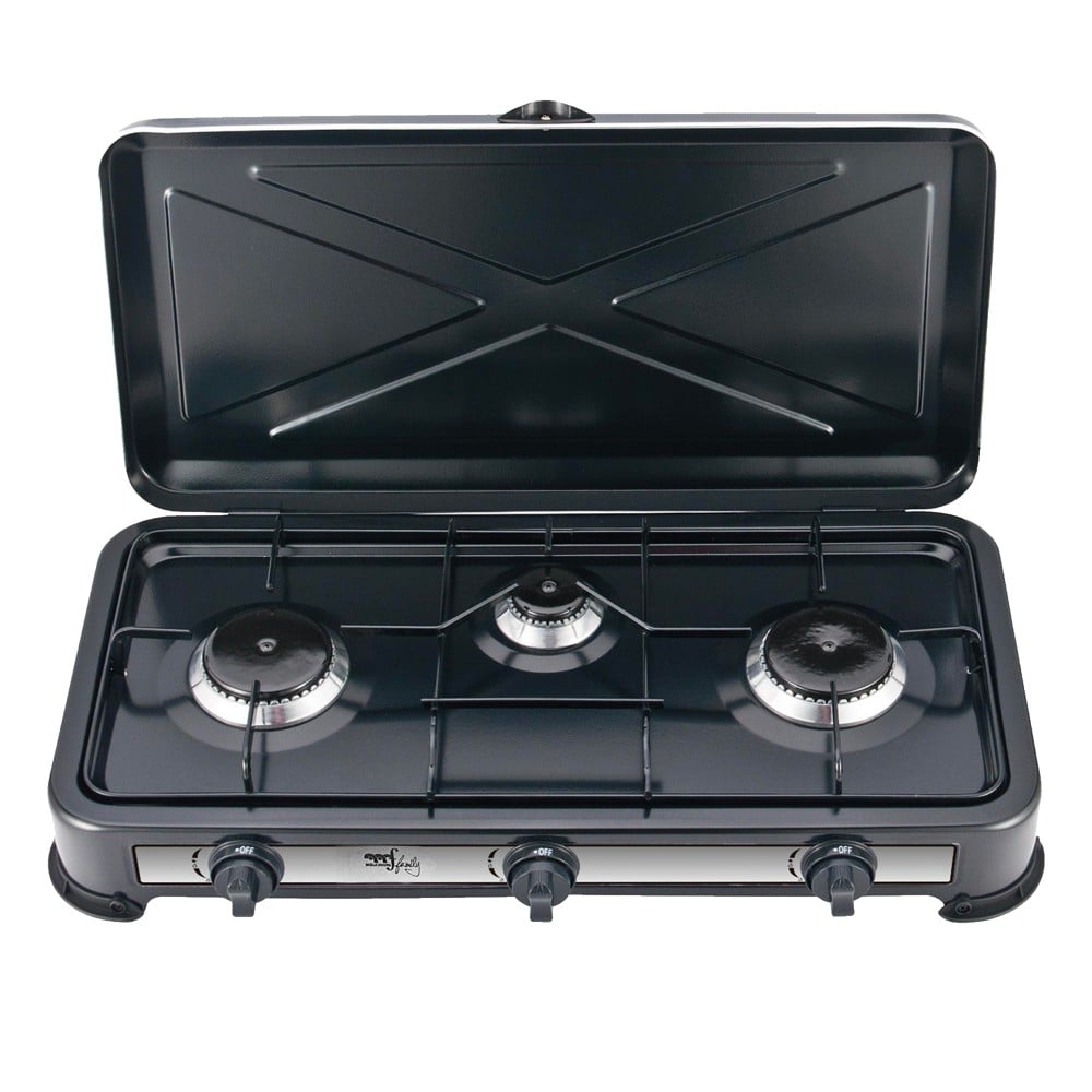 3 burner gas stove with lid, power 2.9 kw, black colour. Protective cover and plastic feet. Enamelled steel structure. Removable grill and burners. Flame regulation. LPG operation. For external use only.