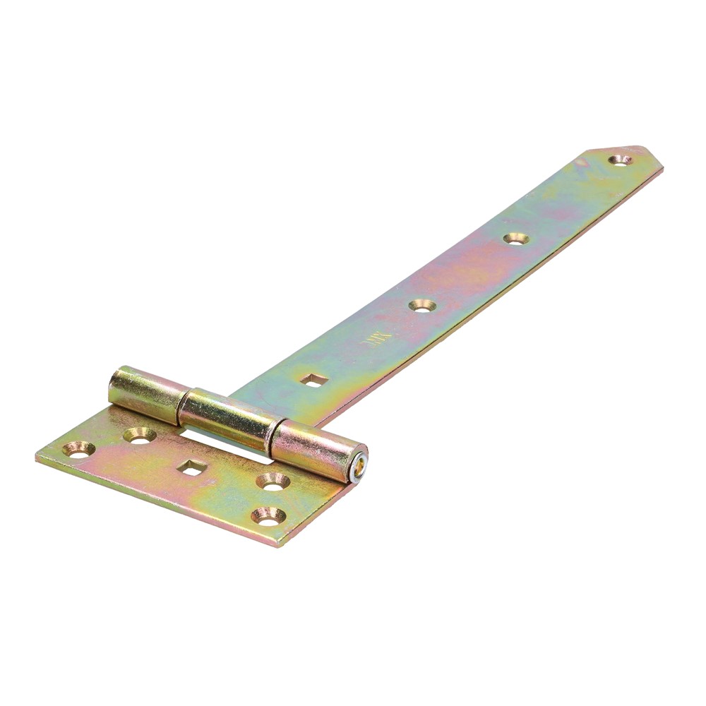 Gate hinge, made of galvanized zinc material, with dimensions of 30x4.5x9x0.3 cm, in golden color. The constituent material is resistant to use, heavy weights, rust or abrasion. It can be used for mounting the outdoor gates of the fences and for other uses.