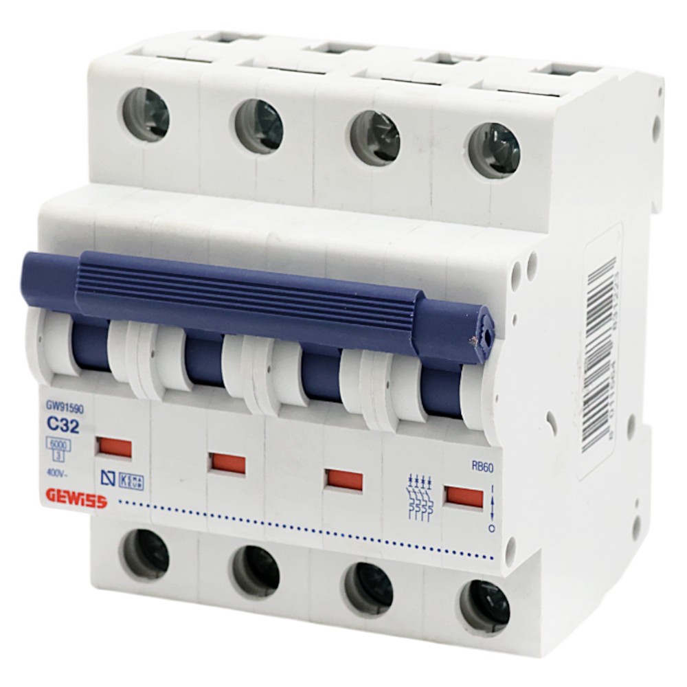 GEWISS magneto-thermal circuit breaker, 4 modules, C, 32A, 6kA. This circuit breaker provides excellent protection for electrical installations by preventing overloads and magnetic discharges. With a capacity of 32A and a breaking capacity of 6kA, it is suitable for use in larger systems, such as commercial, industrial and other installations with high energy demands. The 4-module design ensures that this circuit breaker fits into larger electrical panels, providing stable and efficient protection for your electrical system.