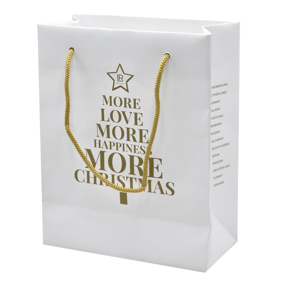 Christmas gift bag, made of cardboard material, in white color, with printed quote in golden color and with rope handles. This product is used for packaging various gifts.
