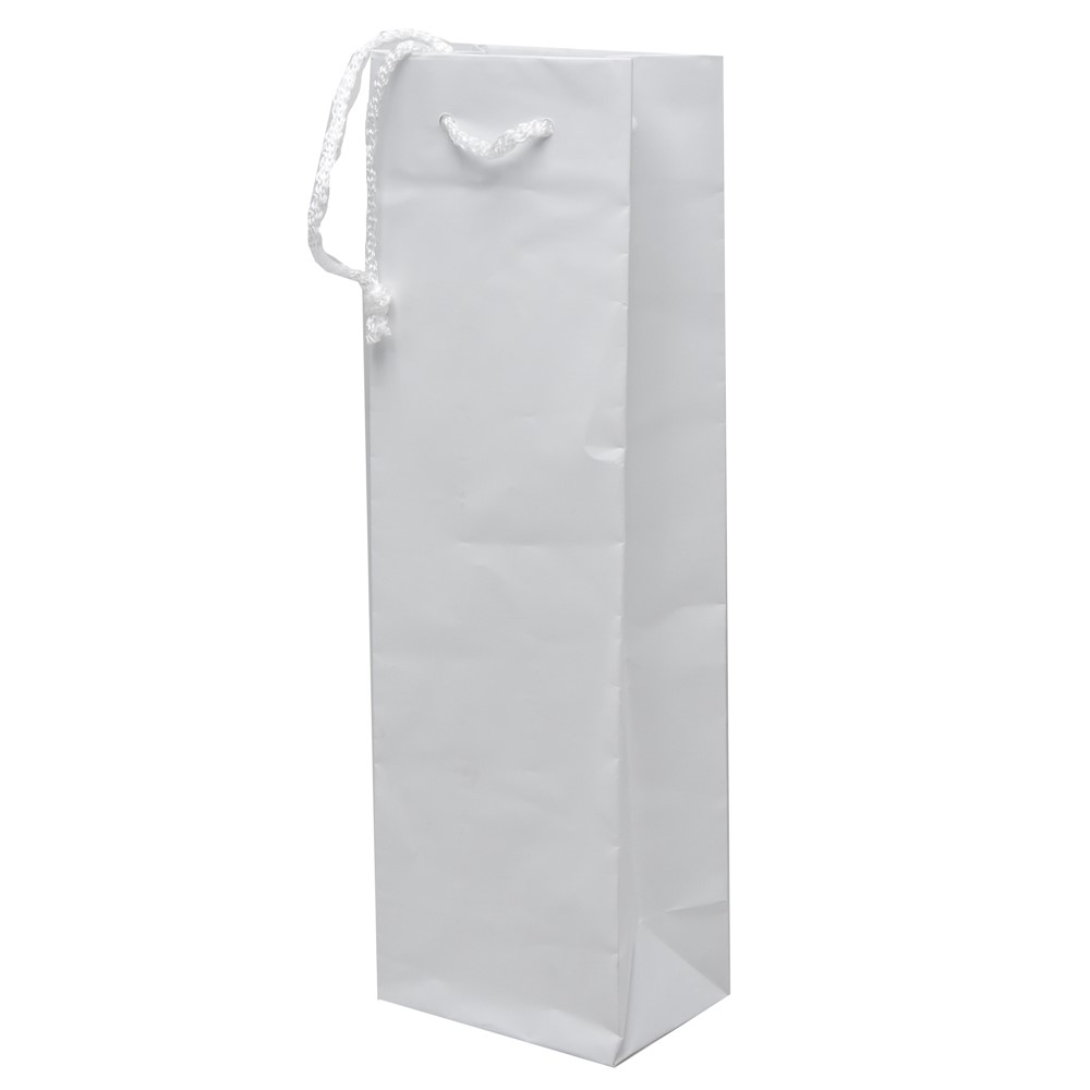 Gift bag for wine bottles, made of paper material in white color. It is used for packaging one wine bottle and is suitable for use as a gift.