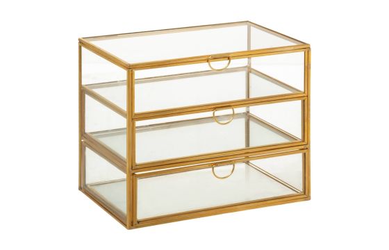 Jewelry box, with 3 drawers, made of transparent glass material, with a structure made of metal material, in golden color, with dimensions of 18x12x15 cm and with mirror bottoms. It can be used in home environments to organize jewelry and various valuable accessories, while managing limited storage spaces. This product is also suitable for use in different shop displays, for displaying jewelry, watches and other accessories, displaying handmade or ornamental knives, precious gemstones, metal figurines, fishing hooks, etc.