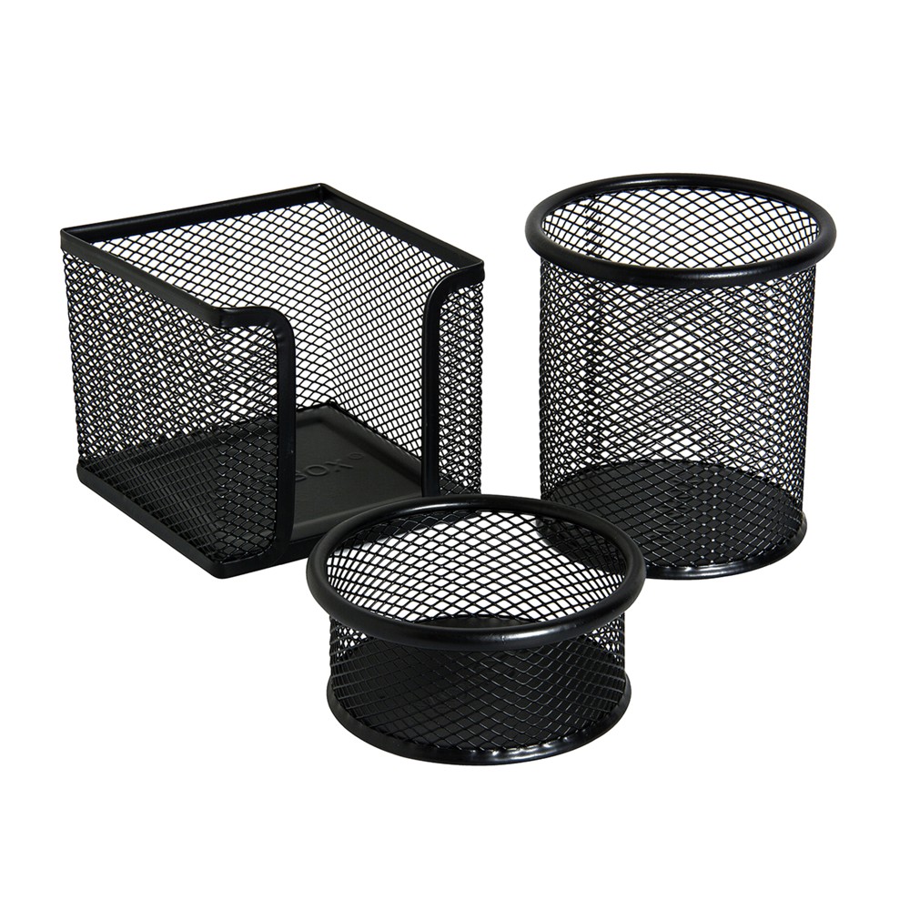 This set includes a circular pencil holder, a small paper clip holder, and a paper holder. All these elements have a beautiful and modern shape and are very useful for organizing the work table in the office, school or home.