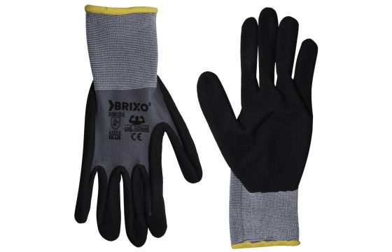 "Nylon / spandex back, sanded nitrile palm, ergonomic shape, maximum dexterity