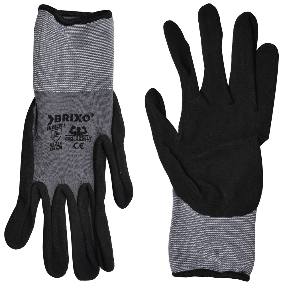 "Nylon / spandex back, sanded nitrile palm, ergonomic shape, maximum dexterity