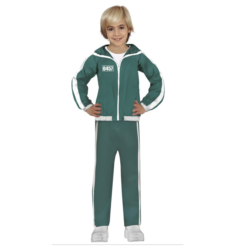 Squid Game Player costume for children, made of polyester material, in green color. The component material is soft to the touch and does not cause skin irritation. This product is suitable for use by children aged 10-12 years, with a height of 142 to 148 cm.