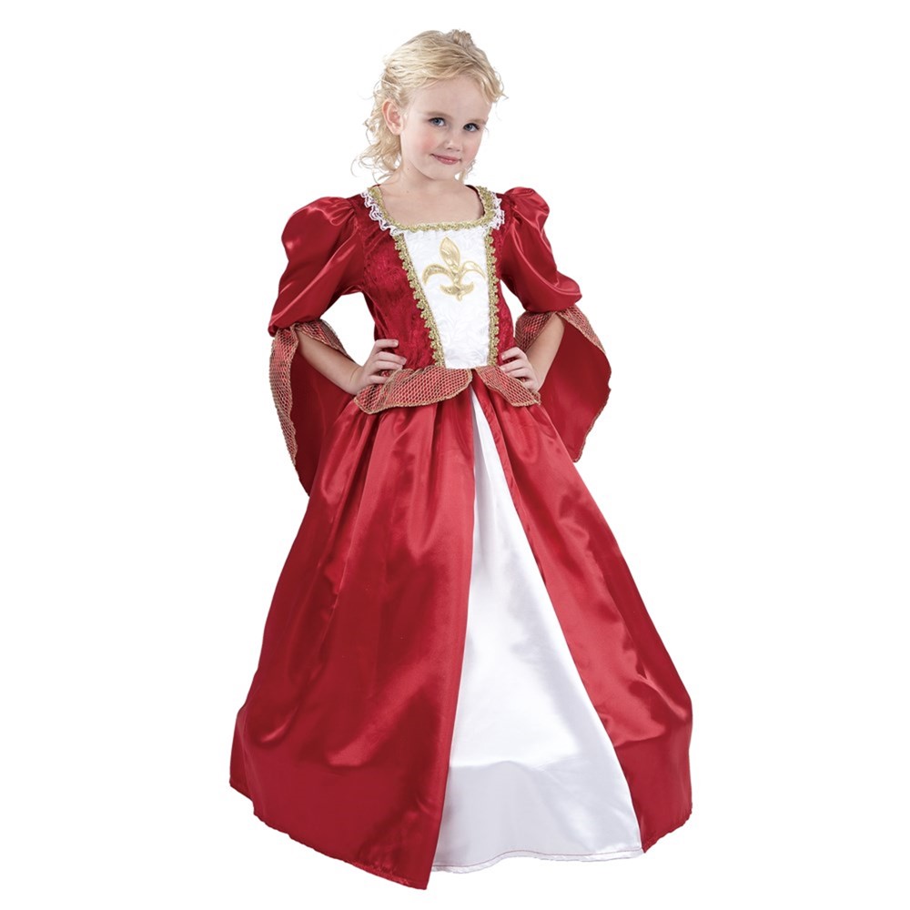 This musketeer dress is made by red satin material, with the top made of velour and decorated with gold braiding and lace. It also has a white brocade style. This great costume can be used in different occassions such as musketeer, tudor, medieval, victorian, princesses.