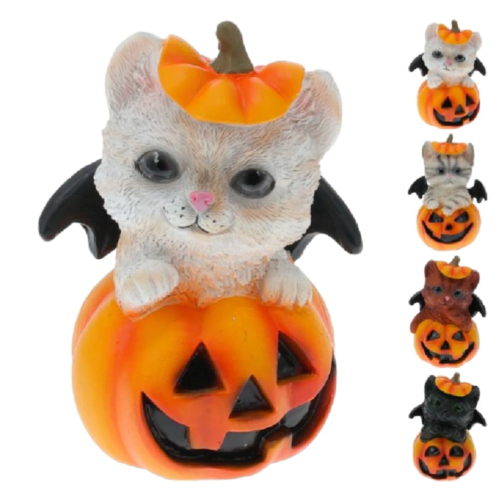 Halloween decoration, cat with pumpkin, 12 cm, polyresin, mixed, 1 piece