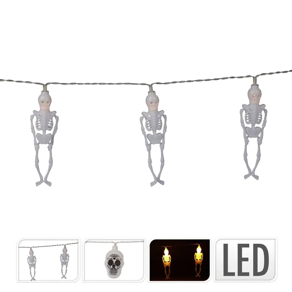 Decorative string for halloween decorations. This string of white polypropylene material, with a skeleton design, is ideal for Halloween decor. It comes in 40 cm size, and has 10 led lights.