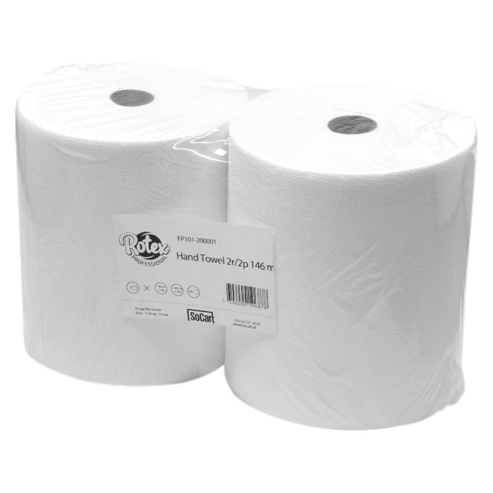 Rotex professional hand towel, ideal for use in commercial and industrial environments. Consists of 2 rolls with 2 layers, offering high resistance and absorption. Each roll is 146 meters long.