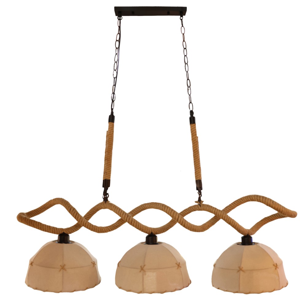 Modern design pendant lamp, equipped with 3 E27 bulbs. It is 100 cm long and 110 cm high, made of metal and natural rope, with a white diffuser that provides soft and pleasant lighting.