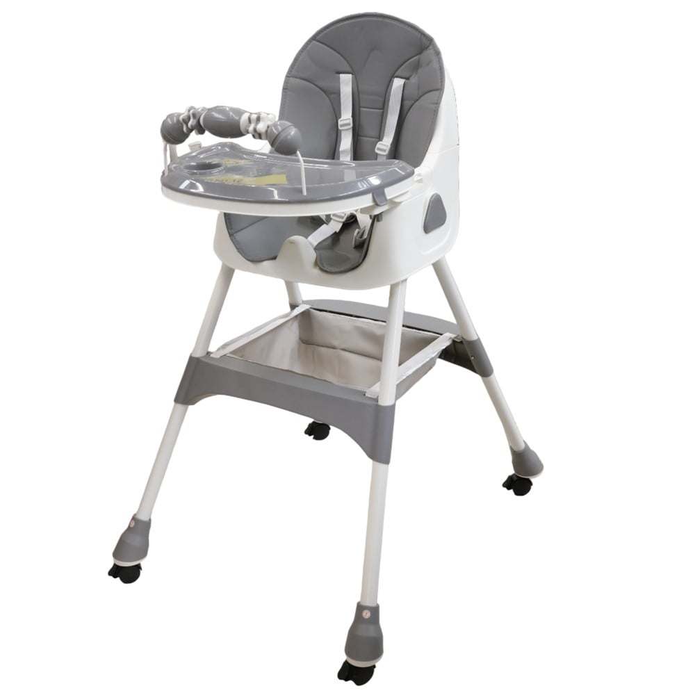 The baby feeding chair, made of aluminum and plastic, has a modern design in gray and is suitable for children over 6 months. Light and durable, with a max carrying weight of 15 kg. This chair provides comfort and safety during feeding, making the process more enjoyable for children and parents. Easy to clean and transport.