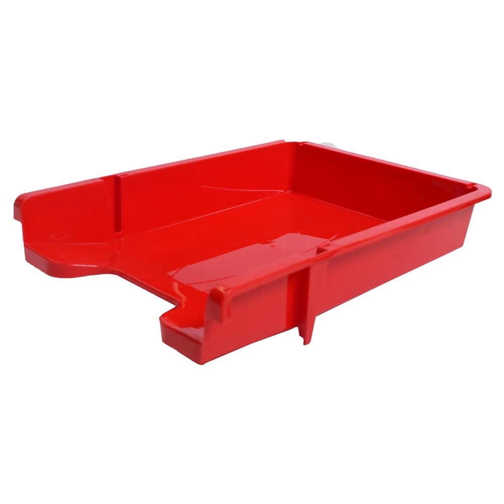 Horizontal tabletop file organiser, made of plastic material, in red color. The file holder is used for organizing the limited desk space, in offices, studios, stationery stores, etc., for placing documents, magazines or other stationery items. This product is suitable for A4 file format, B5 file format and other smaller document formats.