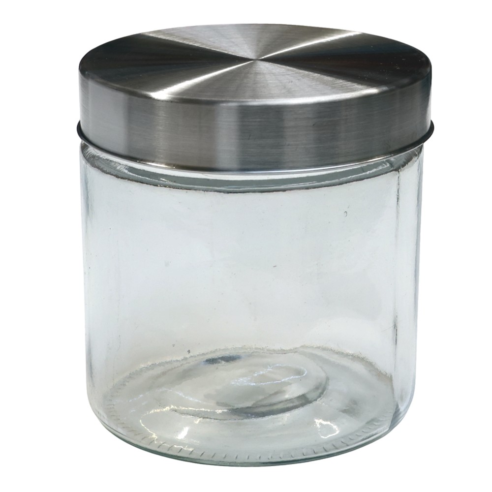 Glass jar with lid, made of glass and metal, in a transparent/gray finish, with a capacity of 700 ml and measuring Dia. 11 x H 12 cm. This practical and stylish jar is ideal for storing food, spices, or other small items. The transparent/gray glass allows for easy identification of contents, while the metal lid ensures a secure closure, keeping items fresh and protected. Durable and easy to clean, it is perfect for everyday use or for organizing your kitchen efficiently.