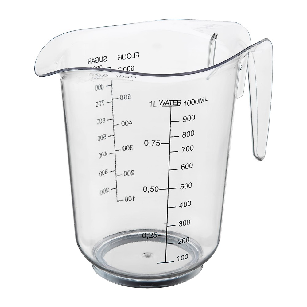 The container has a capacity of 1 liter, which is a sufficient amount to measure liquids or to prepare small amounts of ingredients.