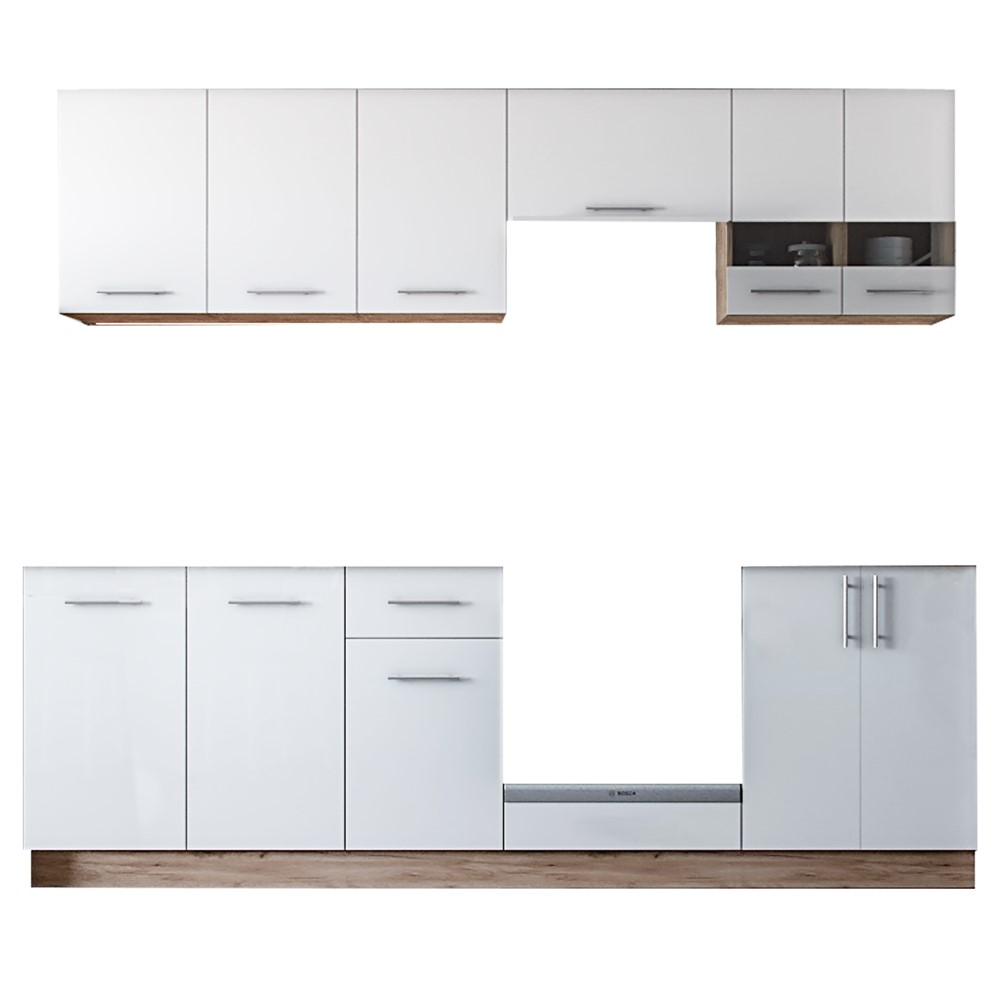 Bianca kitchen, with golden oak color, and an adequate combination of lower and upper elements with the part made of tempered sandblasted glass, will fit perfectly a variety of ambient arrangements. It brings plenty of space for favorite dishes and everything that no housewife would give up. The lower element contributes to additional functionality with the additional storage.