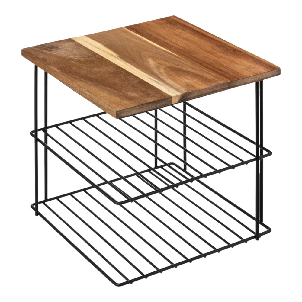 Organization shelf that can be placed on the kitchen counter and utilizes unused space by providing space organization. Made of black metal and the top has moisture resistant acacia wood. On the shelves you can put jars, spices or any small thing you want.