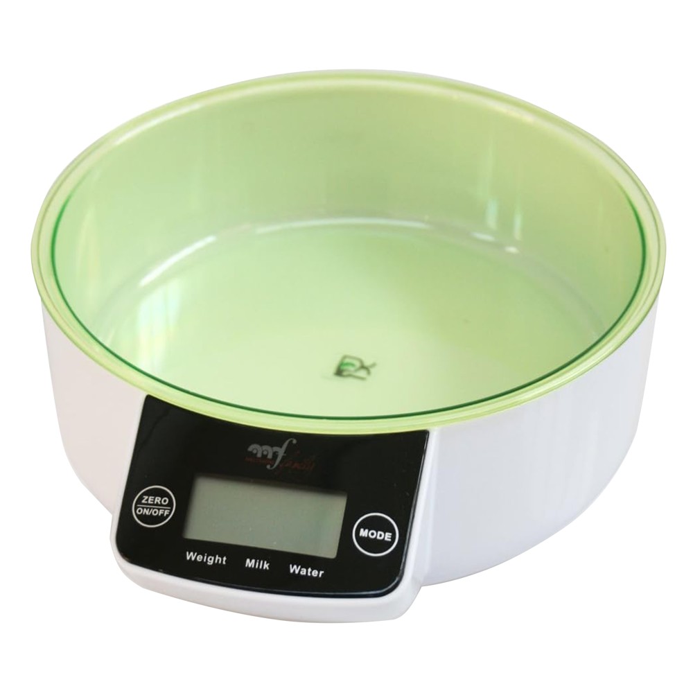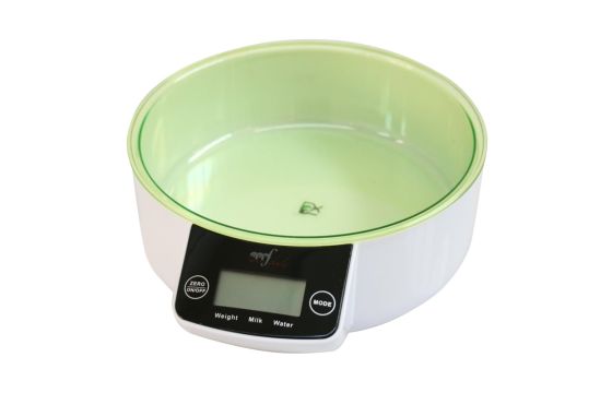 Kitchen scale Melchioni with 5 kg bowl. Weight measurement in grams/ounces. Volume indication for water, milk, oil, flour. Large LCD display. Overload indicator and battery status. Battery powered (1xCR2032).