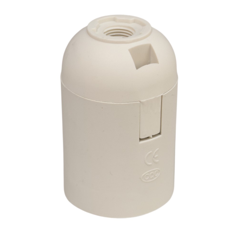 Plastic lamp holder with E27 base, white color. Simple and practical, used for mounting lamps in various environments, ensuring a safe and durable connection.