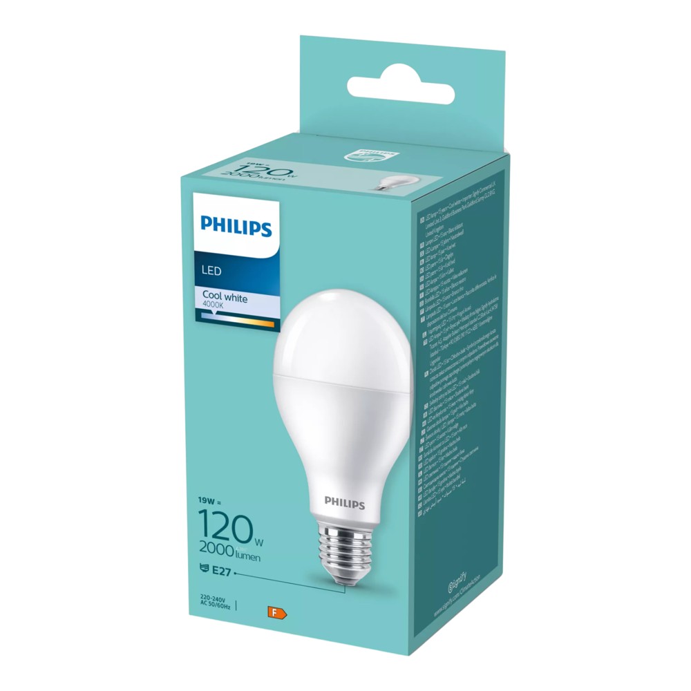Philips LED bulb with E27 base, 19W power (replaces 120W traditional), 4000K neutral light and 2000 lumen luminous flux. Lifespan up to 15,000 hours - provides strong, natural and highly energy-efficient lighting.