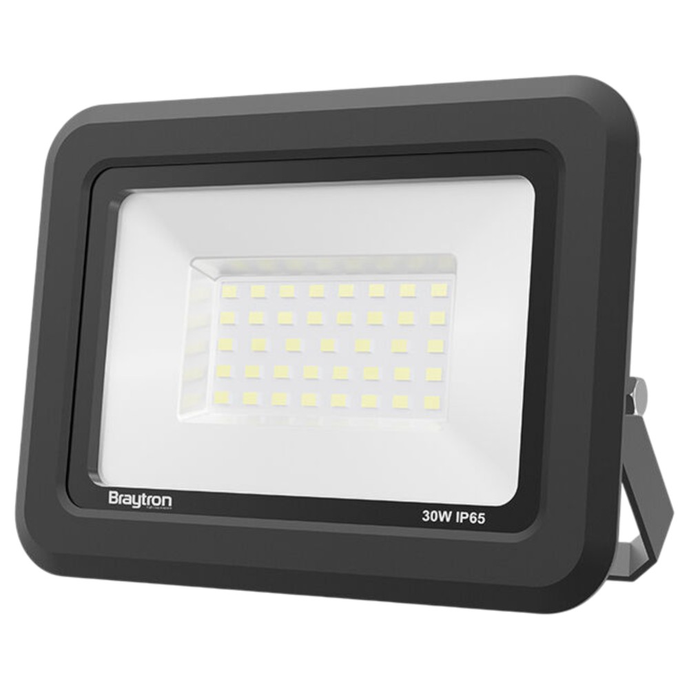 Braytron 30W LED floodlight, with 6500K cool white light and 2550 lumens of brightness. Operates on 220-240V and offers IP65 protection against water and dust. Suitable for outdoor environments, efficient and long-lasting.