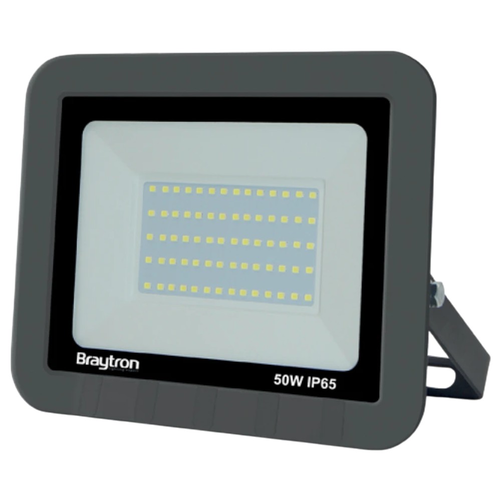 Braytron 50W LED floodlight, with warm light 3000K and 4200 lumens of light output. Operates on 220-240V and offers IP65 protection against water and dust. Suitable for outdoor lighting, energy efficient and with a long lifespan.