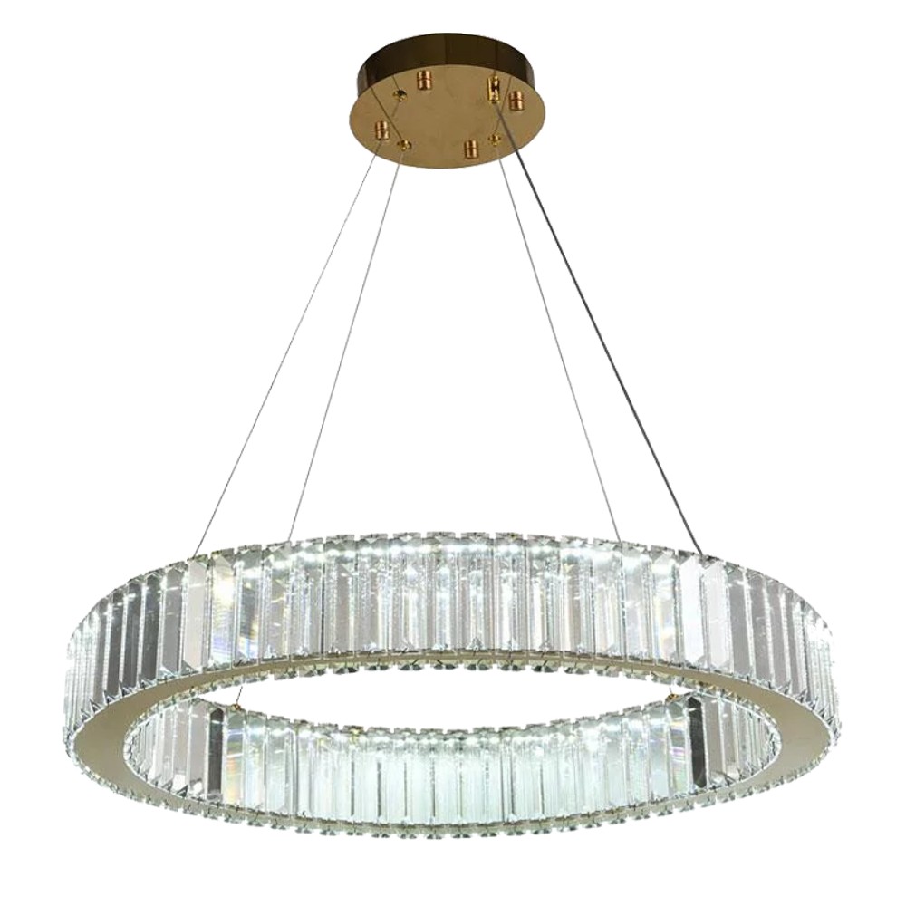 LED pendant light with 40W power and 3300 lm luminous flux. It has a diameter of 60 cm and decorative elements of 6.8 × 6.8 × 1.5 cm, made of metal and crystal with a gold finish, providing sophisticated lighting and a luxurious look to the environment.
