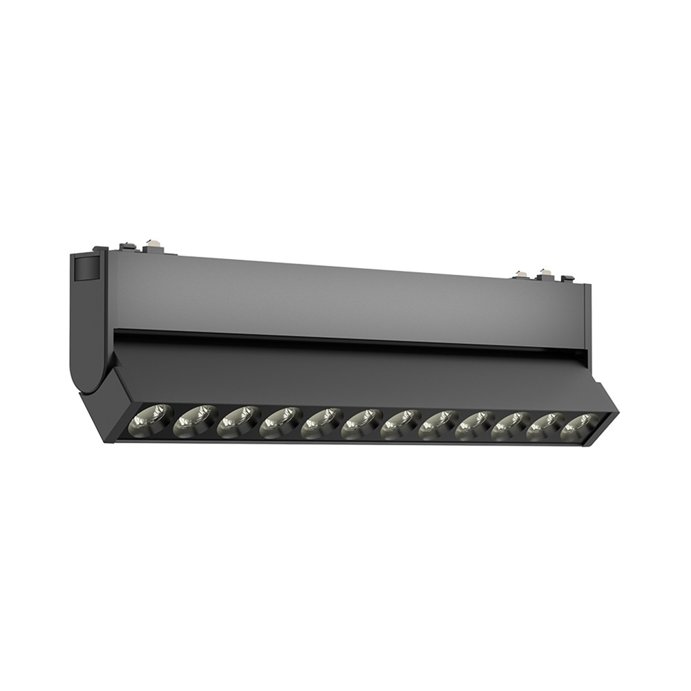 Linear spot for magnetic lighting, 48V, 12W, with 4000K light color (natural white) and defined light angle. Black body, modern design and suitable for focused lighting in office, shop or exhibition environments.