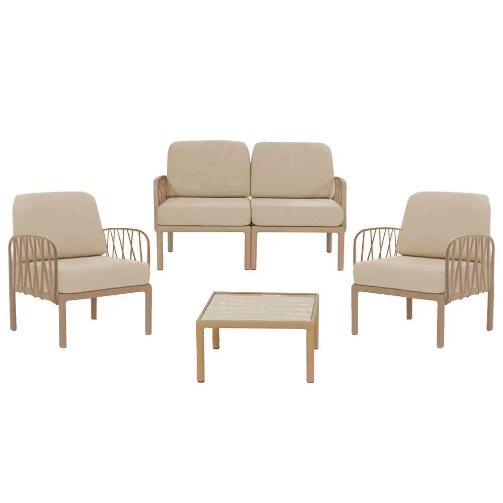 Luna set, 2 single chairs + 1 double armchair + 1 glass top table, PP, cappuccino, 129x64.5xH75 / 68x64.5xH75 / 61.5xH44 cm