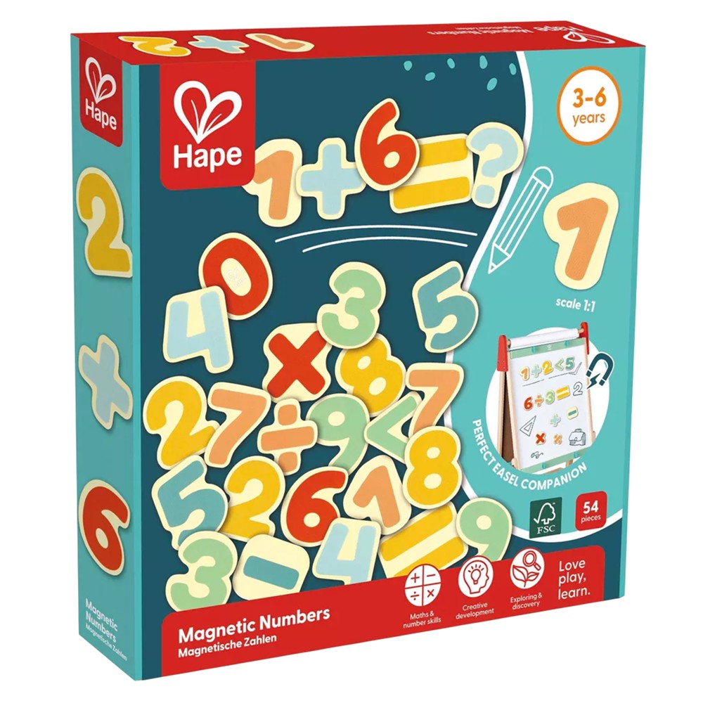 Magnetic Numbers Hape is an educational and fun set that offers children from 3 to 6 years old the opportunity to learn numbers and mathematical concepts through play. This set contains 54 magnetic pieces, including numbers from 0 to 9, and mathematical signs (such as +, -, =), enabling children to create operations and develop early mathematical skills.