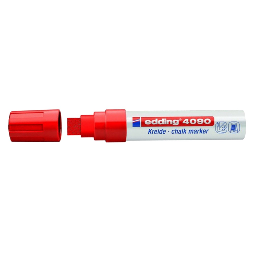 Marker Edding 4090, chalk marker, made of red plastic material measuring 21 cm, with a thickness of the top 4-15 mm. Serves for non-permanent notes with liquid chalk on dark tiles, in