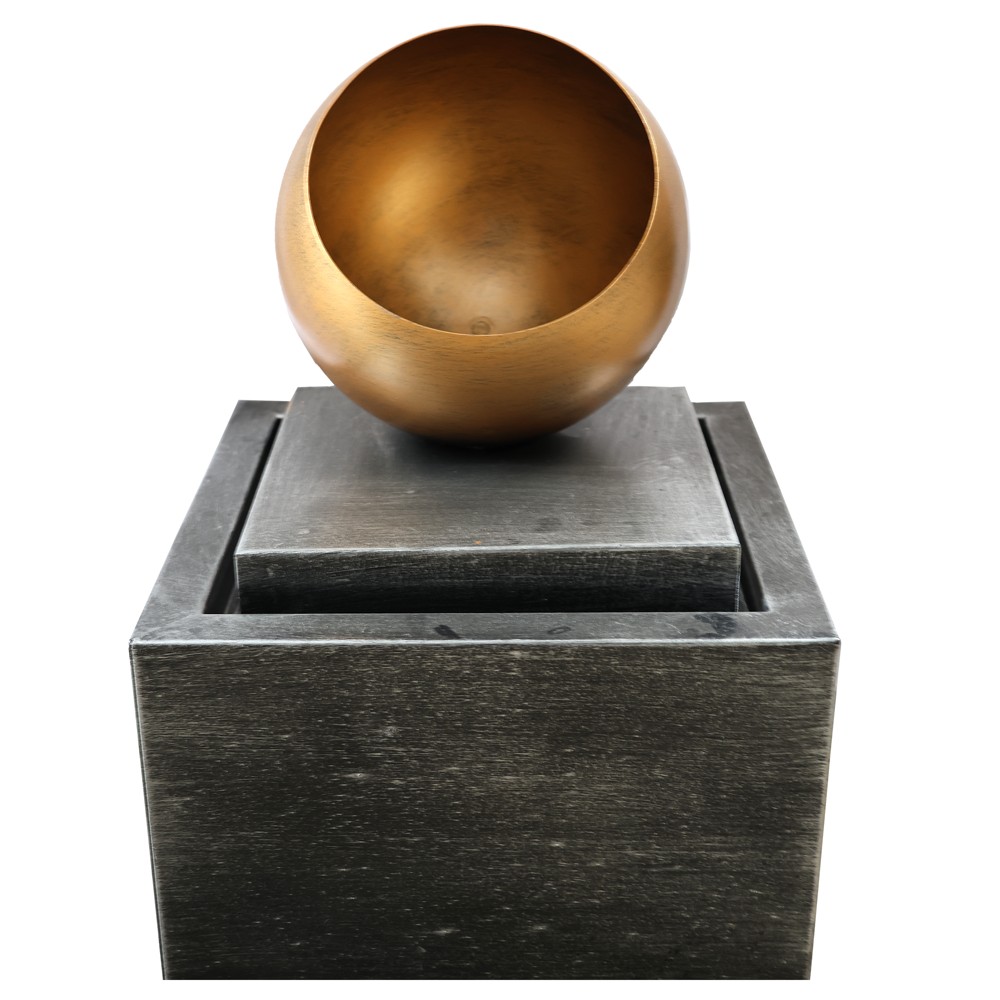 Metal fountain W/one warm white LED with water pump 10m cable. Product size:29x29x40cm. They have the appearance of natural stone. To add a relaxing and beautiful element to your surroundings and to bring nature near you, this fountain is the solution. They can be placed inside or outside.