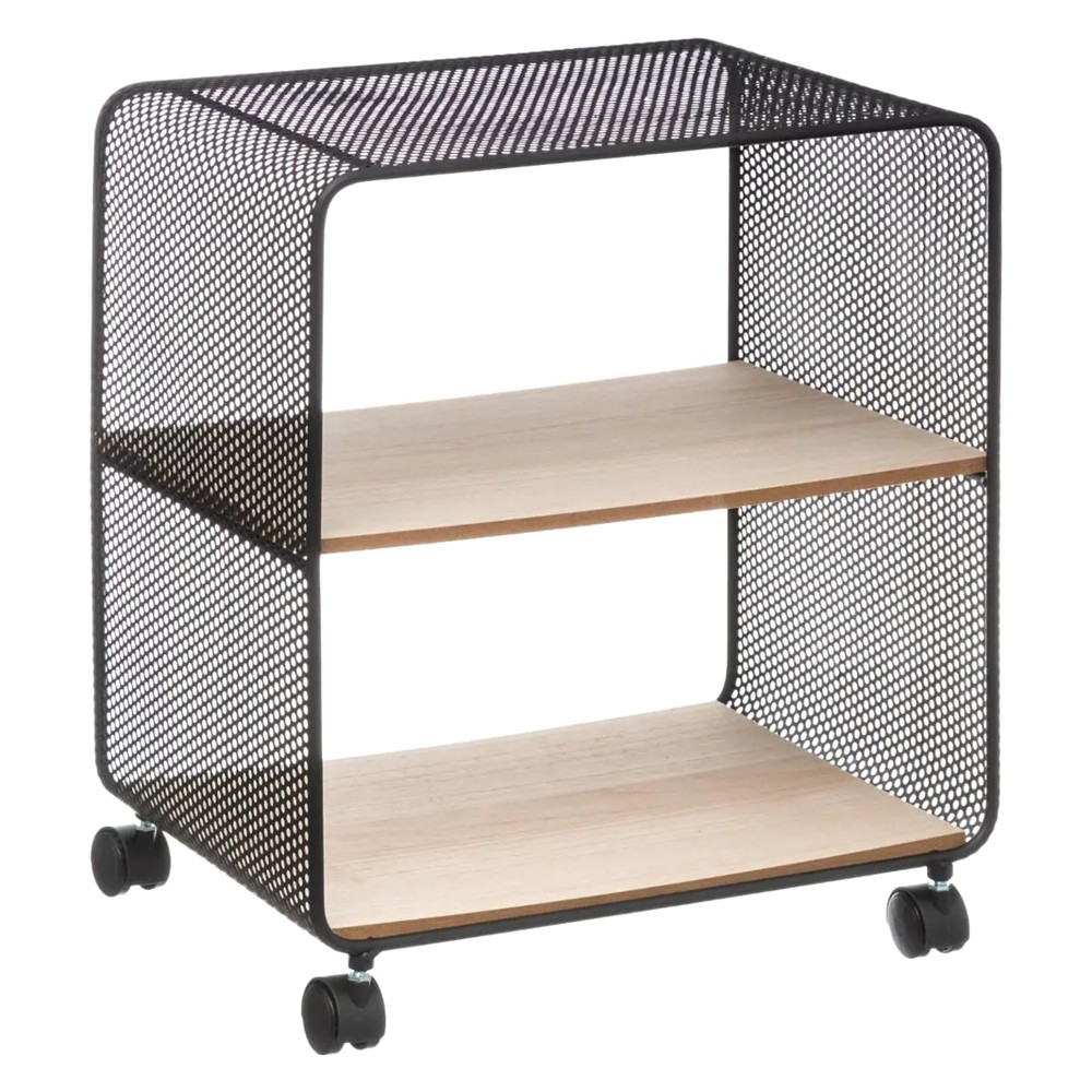 Metal shelf with 2 floors. MDF and metal material, black and brown. Dimensions 43.5x27.8xH51 cm. With wheels that make it possible to move as easily. Practical and very functional for your environment.
